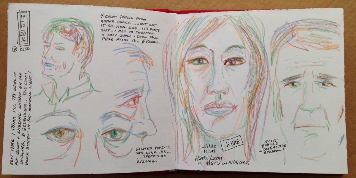 December: Portrait practice from TV as I toy with a kid’s four-color pencil.