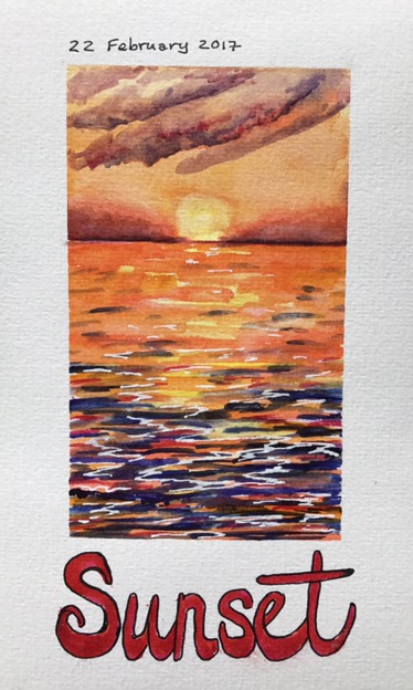 Several years ago I found myself in the same situation and found Laure Ferlita and her online classes where I took her watercolor class: An Imaginary Visit to th Beach. Fortunately, I’ve been following her blog, Painted Thoughts, and saw a link to her online watercolor sunset workshop at a very reasonable cost of ten dollars