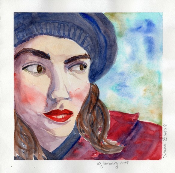 Here I quickly sketched her in pencil and then put in light washes for her skin tones and shadows before putting in the background wet in wet. I decided to aim for bold.