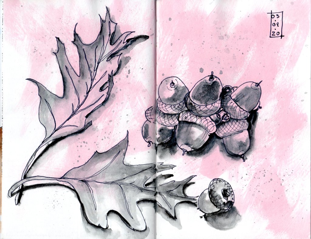 Over the years the spindly young oak in my backyard has become quite grand and has started producing an amazing number of acorns, much to my and the squirrels’, delight.