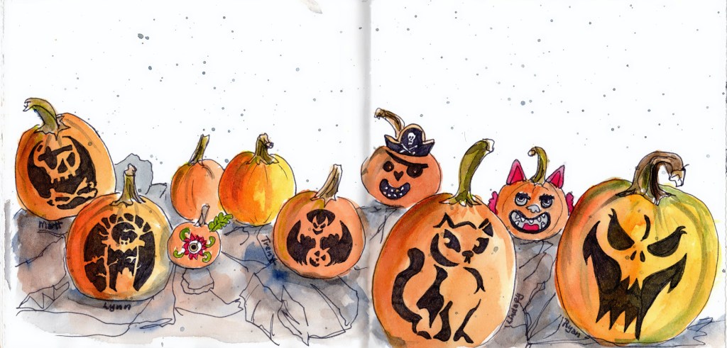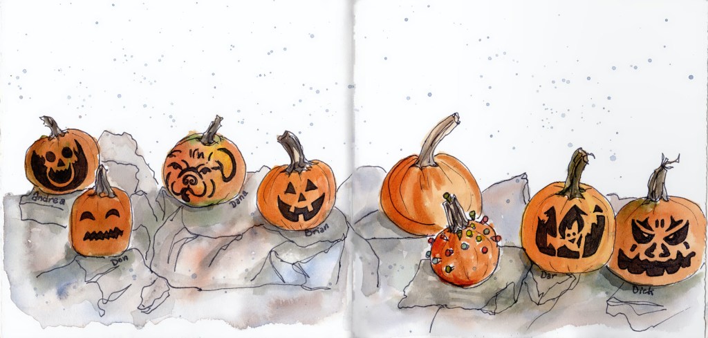 This year on our big family camping weekend we carved and decorated so many pumpkins I needed two full spreads in my journal to document them all sitting on the low rock wall bordering our sites.