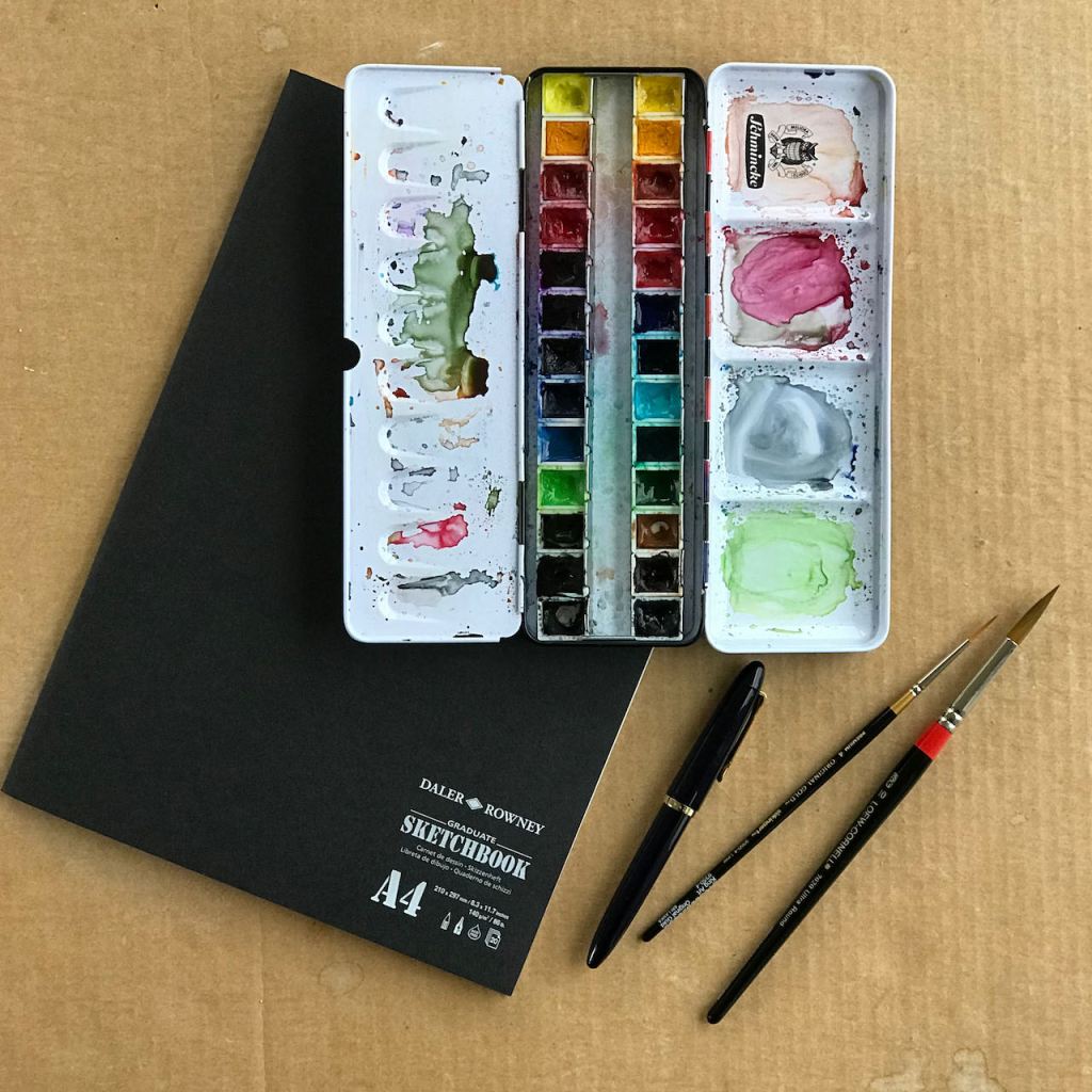 This year my character’s using ink and watercolor in an A4 sketchbook not meant for wet media. Does she care? Not a bit. Join me as we see what piques her interest this month.