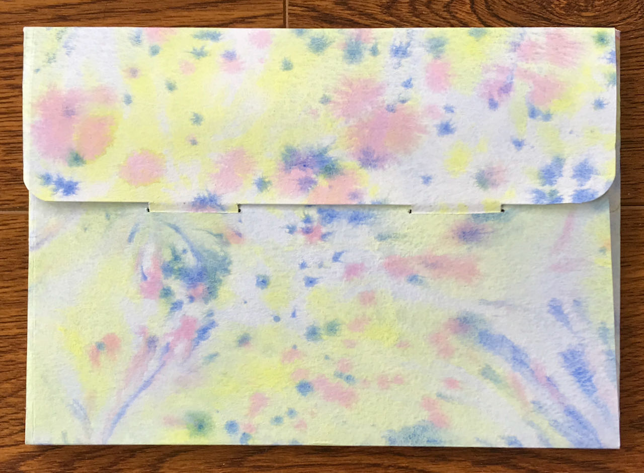 I first painted a sheet of 300 gsm / 140 lb. watercolor paper with dilute acrylic paint and cut it to allow the flaps to overlap and cover the signature. I rounded the corners and made two tabs with corresponding slots for the closure.