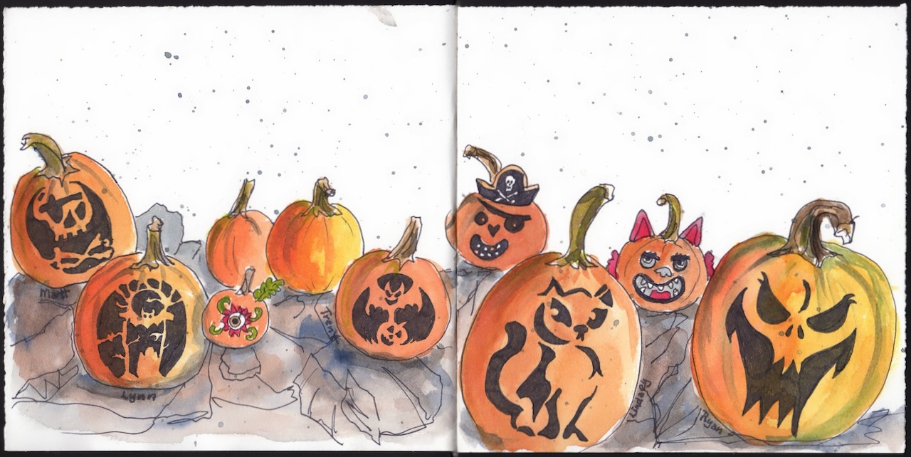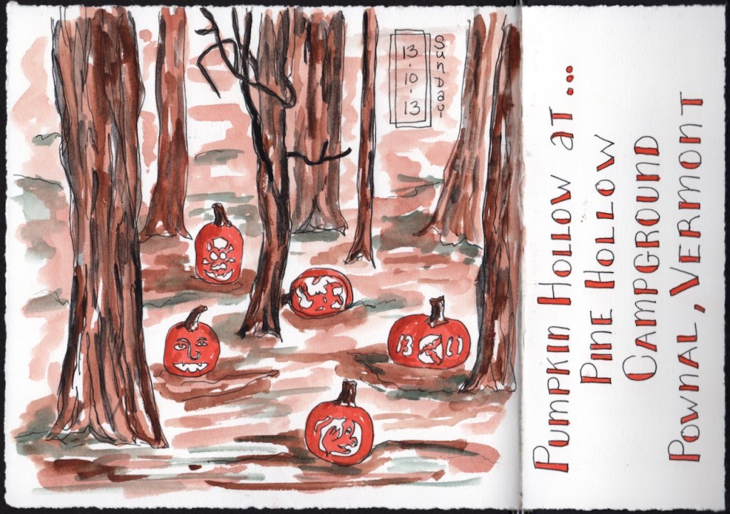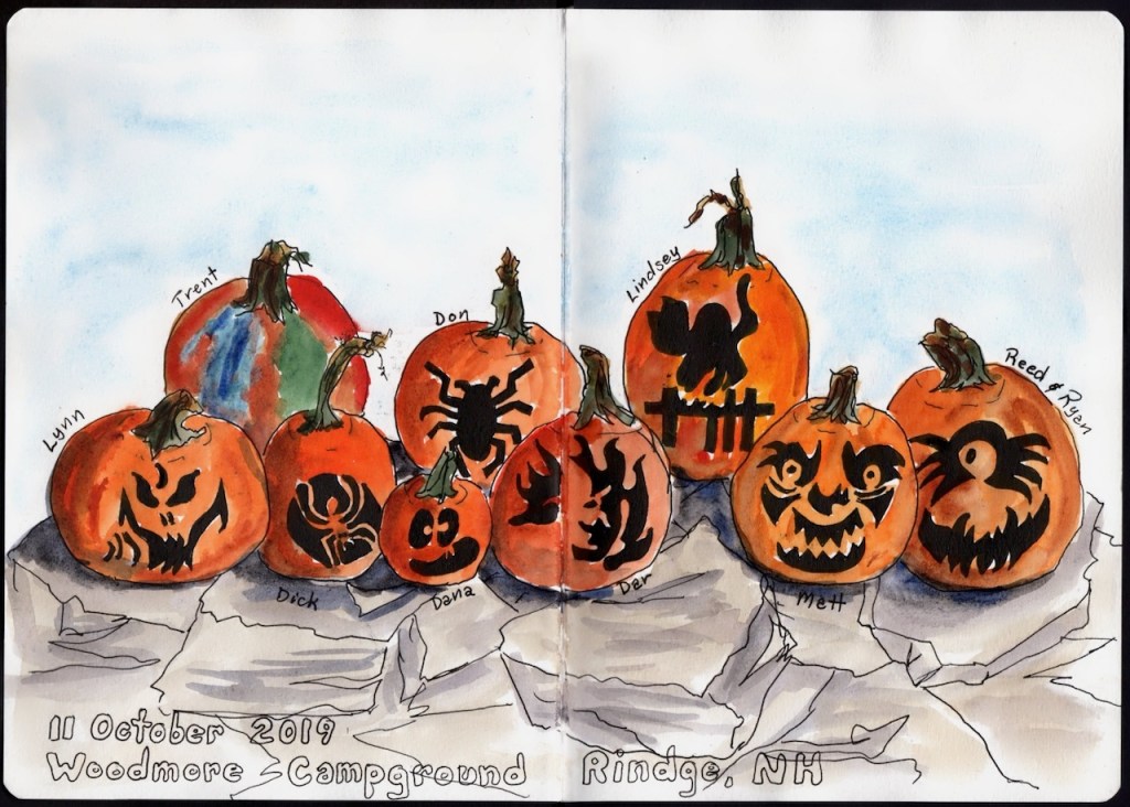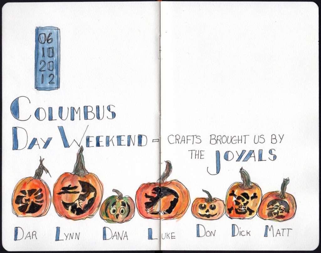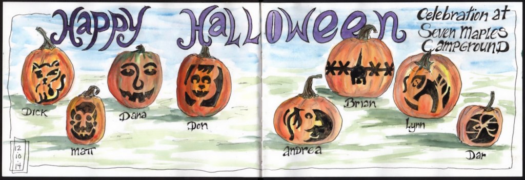 Over the years our extended family has gone camping over Columbus Day / Indigenous People’s Weekend. 2012 marks the start of the family pumpkin carving ritual and my ritual of documenting the artwork in my journal.