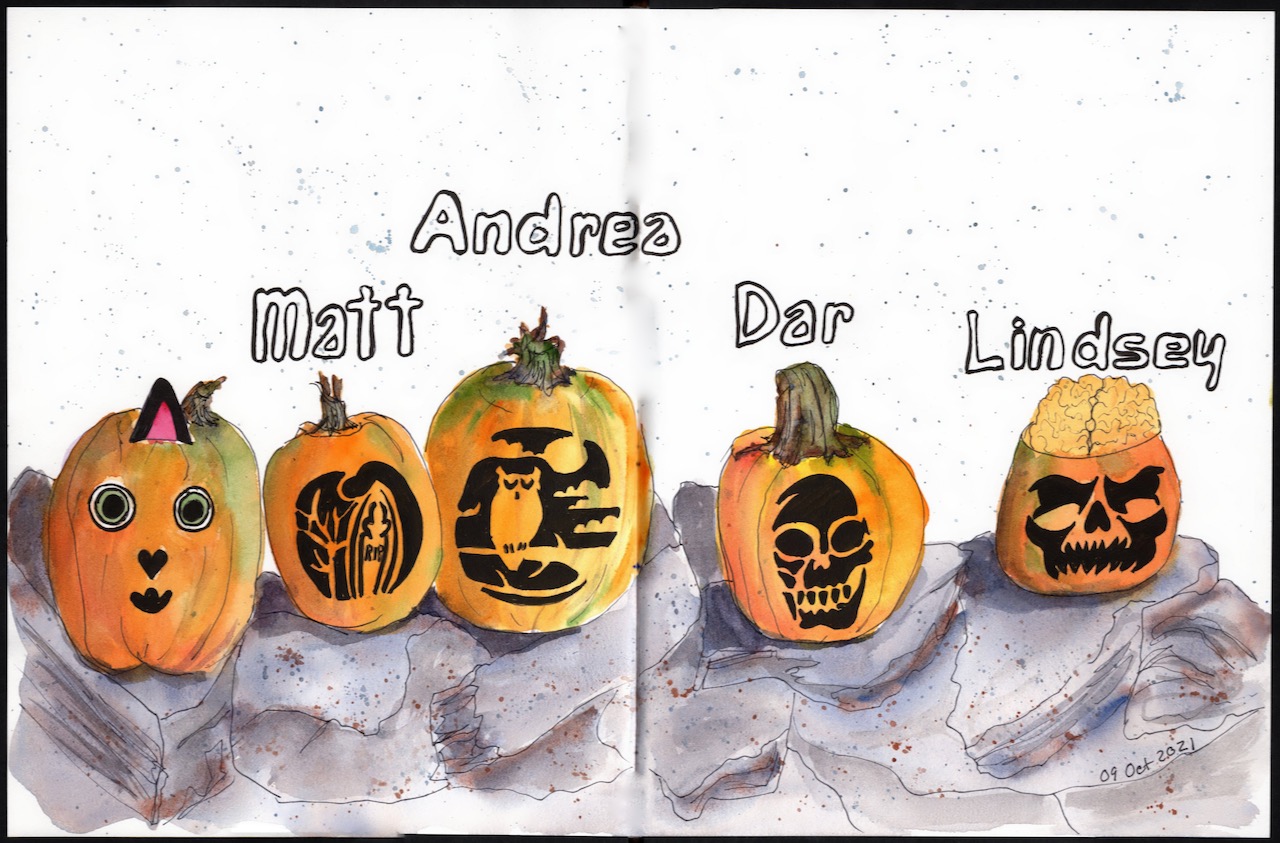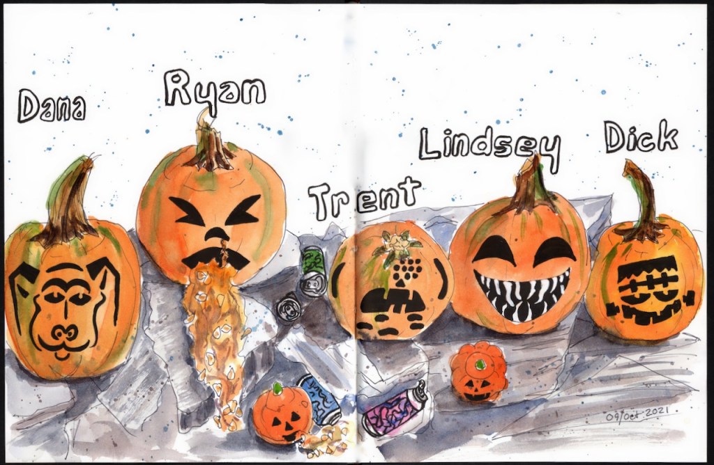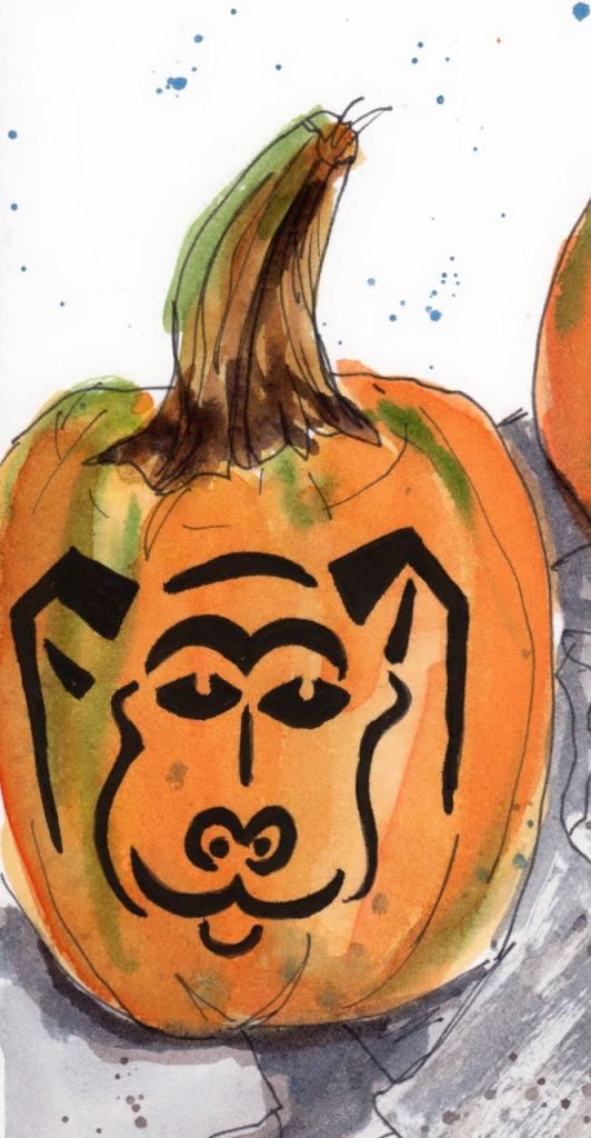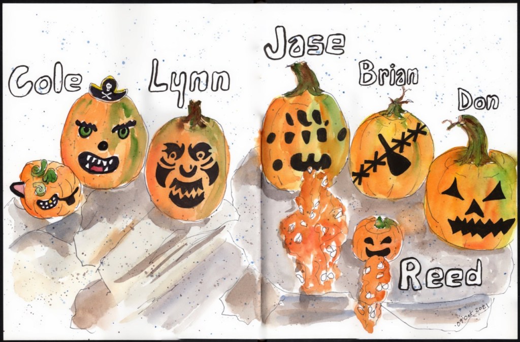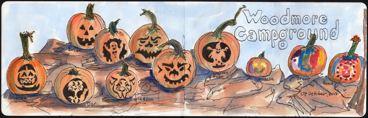 Over the years our extended family has gone camping over Columbus Day / Indigenous People’s Weekend. 2012 marks the start of the family pumpkin carving ritual and my ritual of documenting the artwork in my journal.