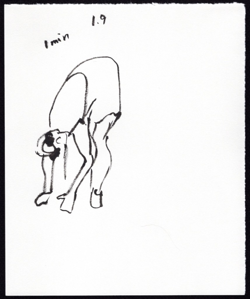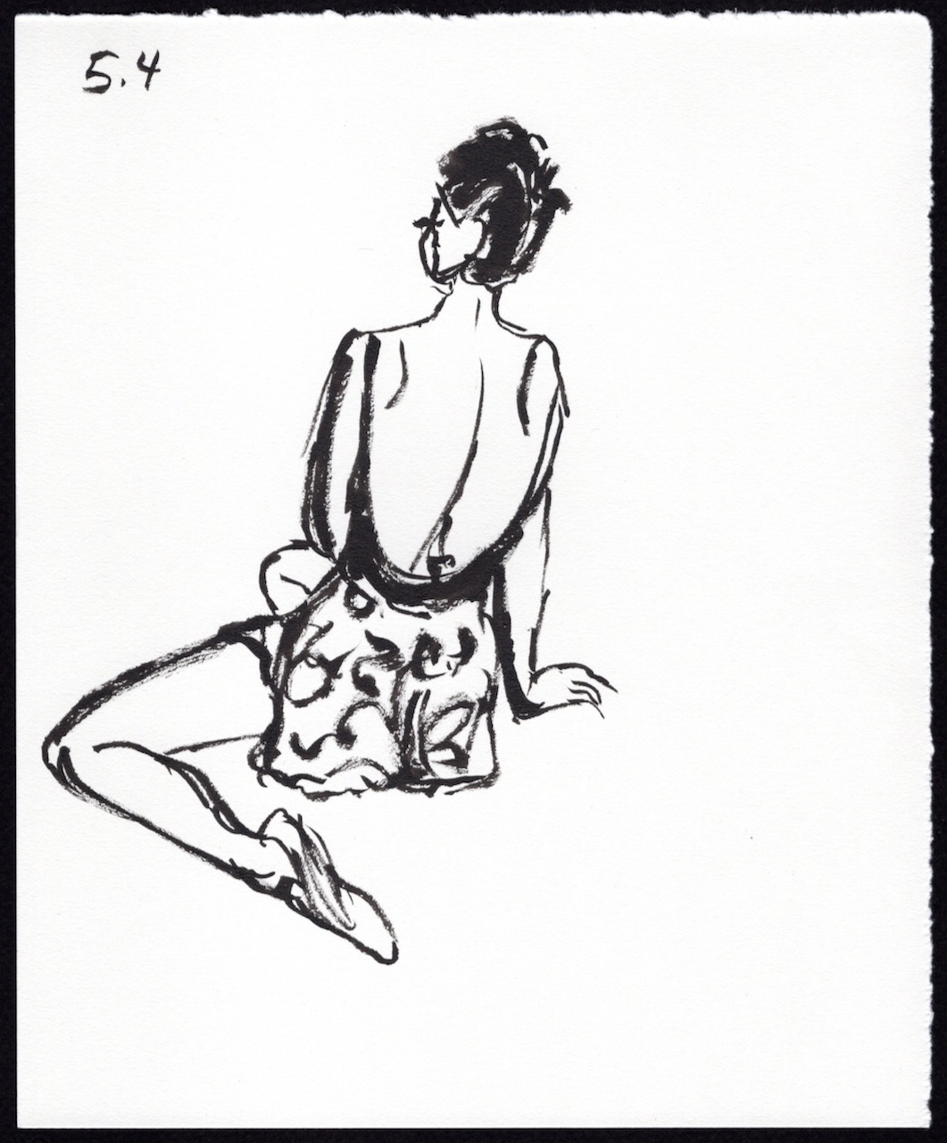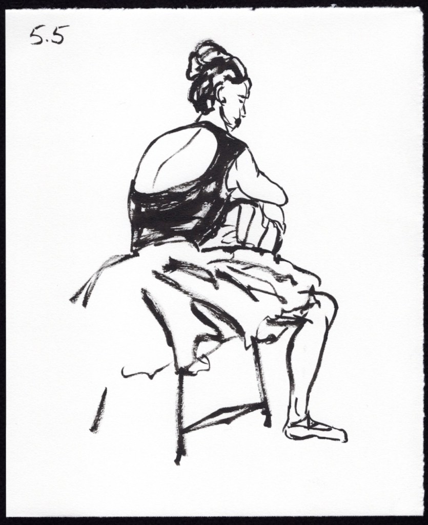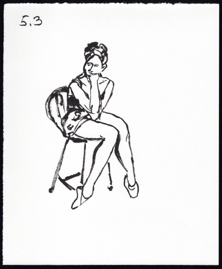 I’m presenting my sketches in chronological order with a number key above each image. The first number is the number of minutes Leigh held the pose and the second number is the sequence number. For example: 5.4 means it’s a 5 minute pose and it’s the 4th time I’ve drawn a 5 minute pose. I used a black Pentel Pocket Brush Pen on 7 in. x 8.5 in. pieces of Strathmore Drawing Paper.