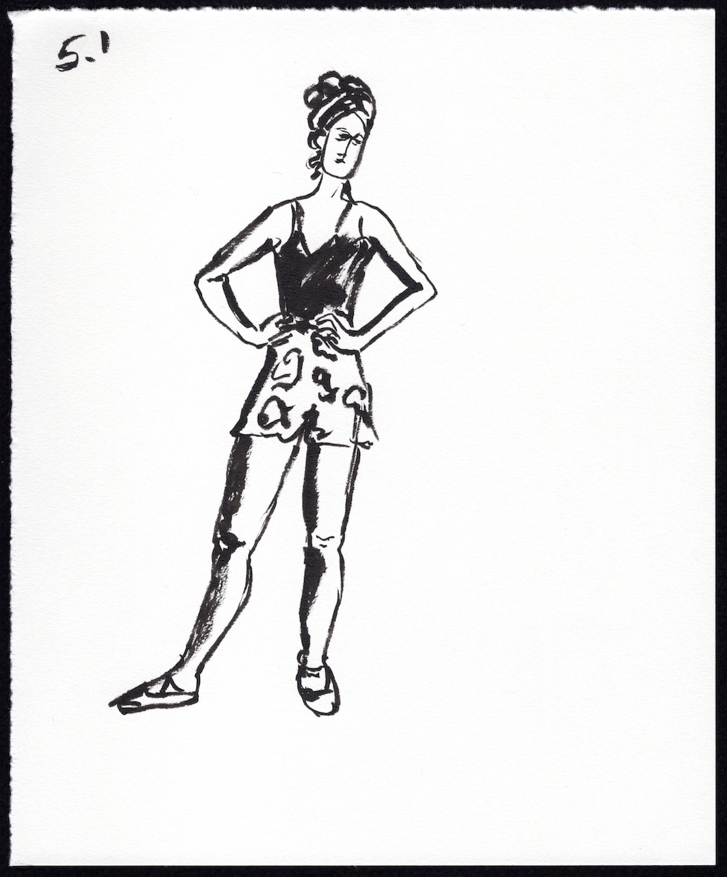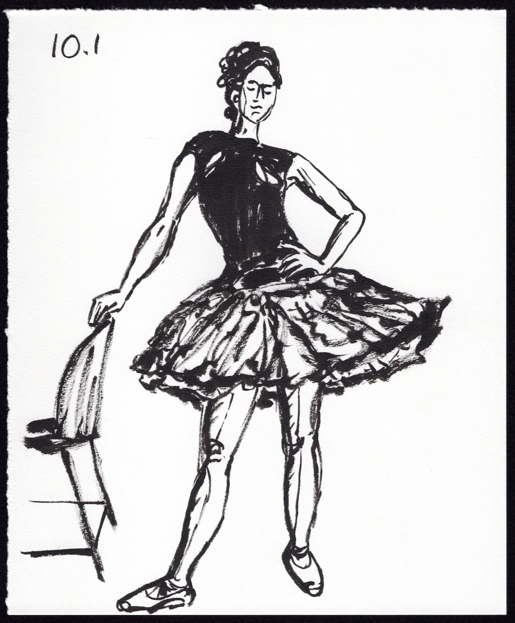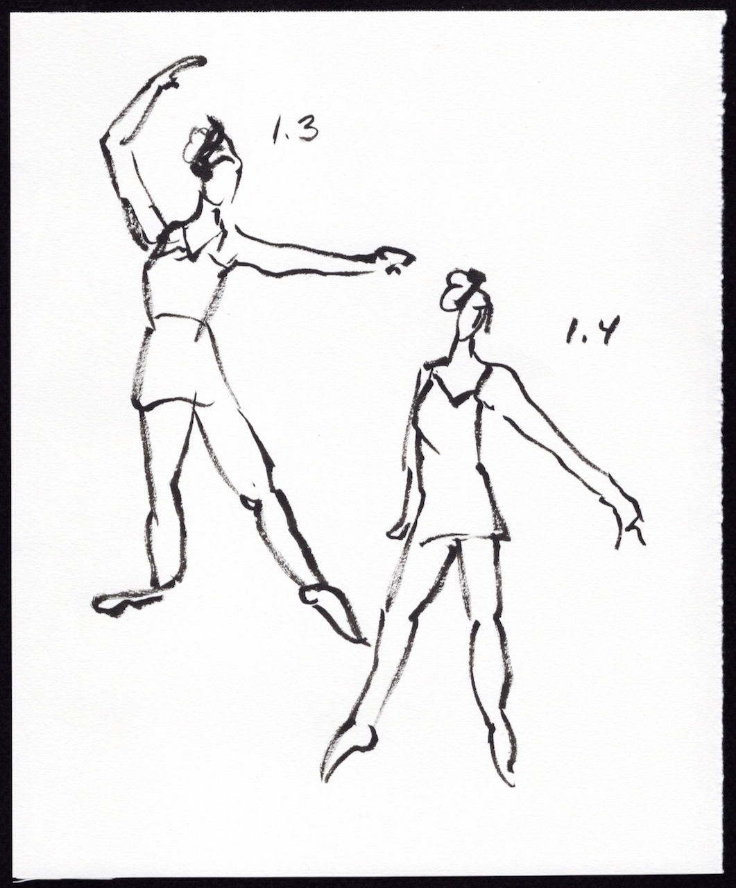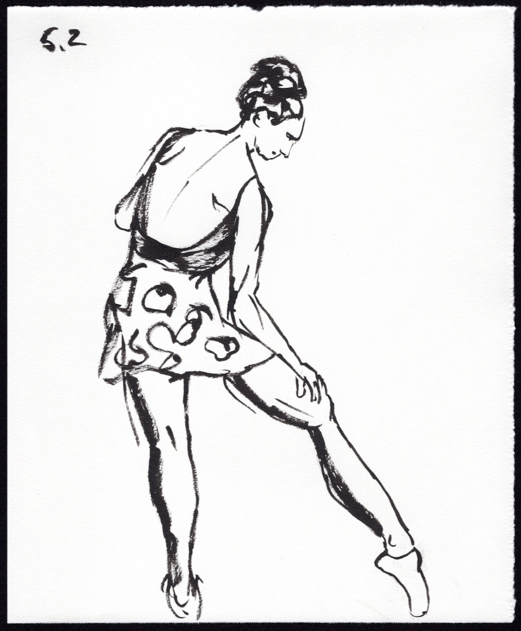 I’m presenting my sketches in chronological order with a number key above each image. The first number is the number of minutes Leigh held the pose and the second number is the sequence number. For example: 5.4 means it’s a 5 minute pose and it’s the 4th time I’ve drawn a 5 minute pose. I used a black Pentel Pocket Brush Pen on 7 in. x 8.5 in. pieces of Strathmore Drawing Paper.