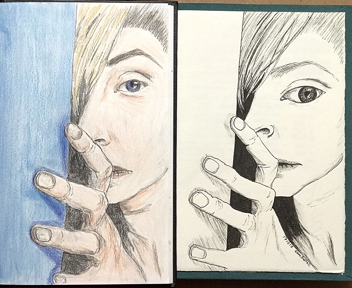 Better. I even thought I was done. But no. I’m sure you can see it too… there’s something wrong with the eye on the left. His eyes aren’t tracking correctly… he’s cross-eyed in my journal but not in his photo. (I’m sorry I can’t show you the photo but he owns the copyright and I don’t have permission to post it. You can see it linked to my work in Sktchy.)