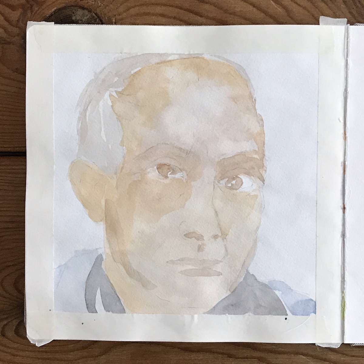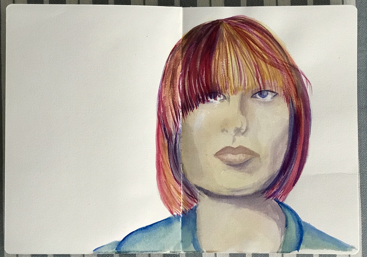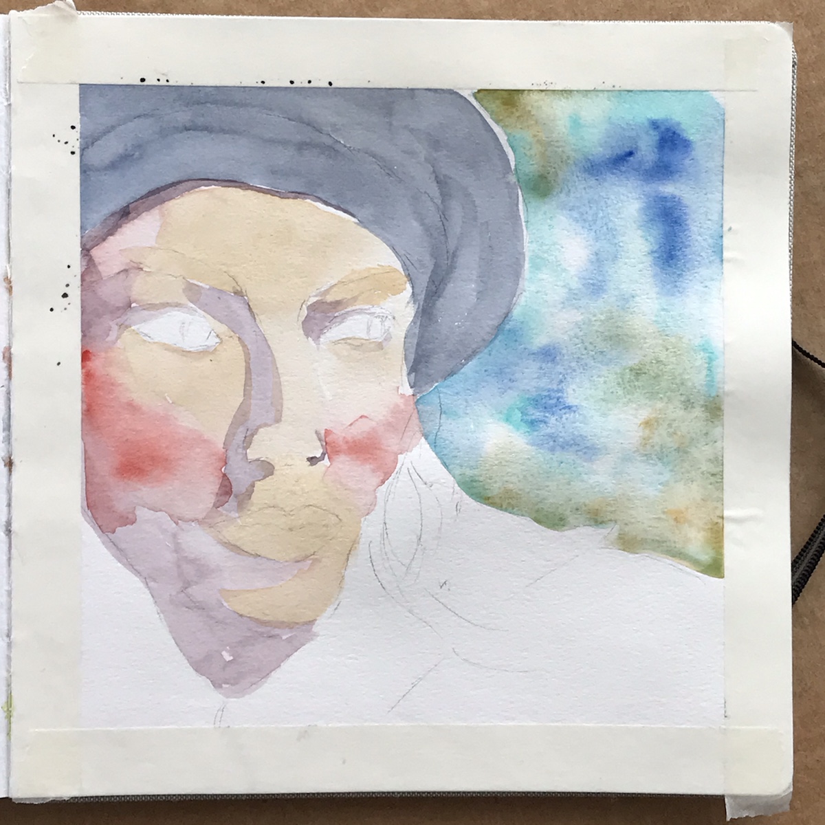 Pencil and Watercolor in an 8″ square HandBook Watercolor Journal. Portrait of a muse from Sktchy.