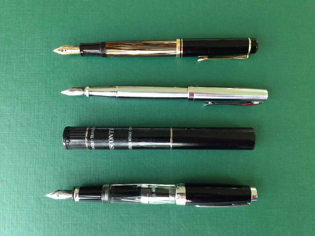 From left to right… TWSBI Mini Fine, Visconti Traveling Ink Pot, Pelican M200 Fine, Duke with bent calligraphy nib, Pentel Pocket Brush Pen, Pelican M200 Medium, Lamy Joy with 1.5 calligraphy nib, Platinum Preppy, Lamy Safari Extra Fine, Lamy Vista black EF, Lamy Al-Star F, and an old Mont Blanc rollerball, just because it writes well.