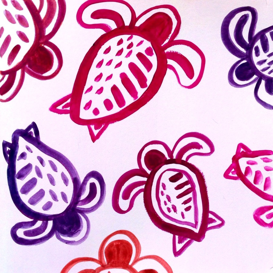 Next I was inspired by a favorite batik pattern… ooops! The full tortoise in the lower right is the correct pattern. I forgot the second line on the shell for all the others. And yes, I painted the entire page first with acrylic before I even thought about gouache.