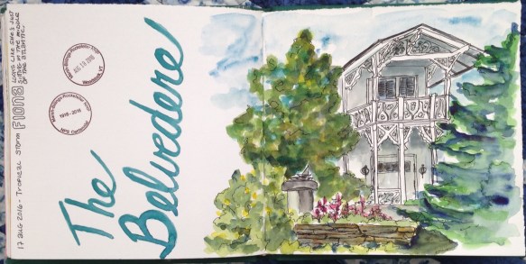 I’m boring… I paint the same building each time, the Little Studio, getting better with every rendition even though I continue to struggle with perspective. This day I sat in the field ignoring the yellow-jacket buzzing around me and focused on grape vines twining on the pergola as the tours came and went.