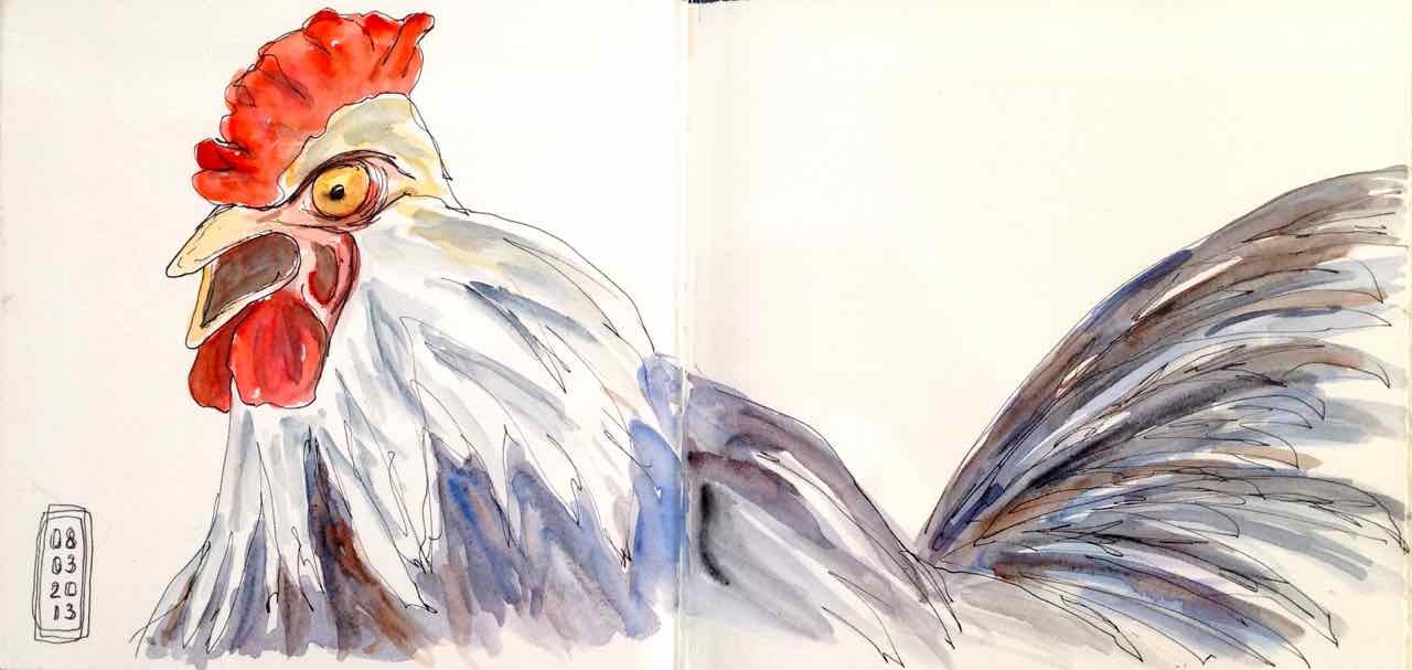 The Avian Flu Virus has plagued the upper midwest causing the fairs like the Minnesota State Fair to cancel their poultry exhibit. We’re fortunate, so far New England has been spared, allowing the Hopkinton exhibit to continue this year.  Each year I’ve been able to sketch the fantastical variety of poultry breeds but this year was special.  I managed to paint my sketches as I stood before each bird… a major accomplishment in my art progress! No painting later at home this year.
