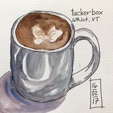 Winter has been creeping up on us and it’s become tougher to brave the elements and sketch outside. Thank goodness for the welcoming ambiance of a local café… the Tuckerbox, located on a corner in downtown White River Jct. Vermont.